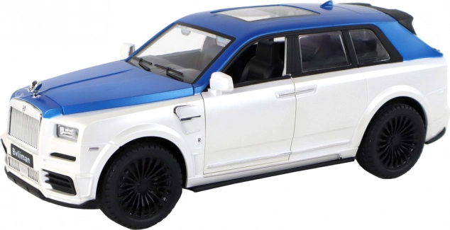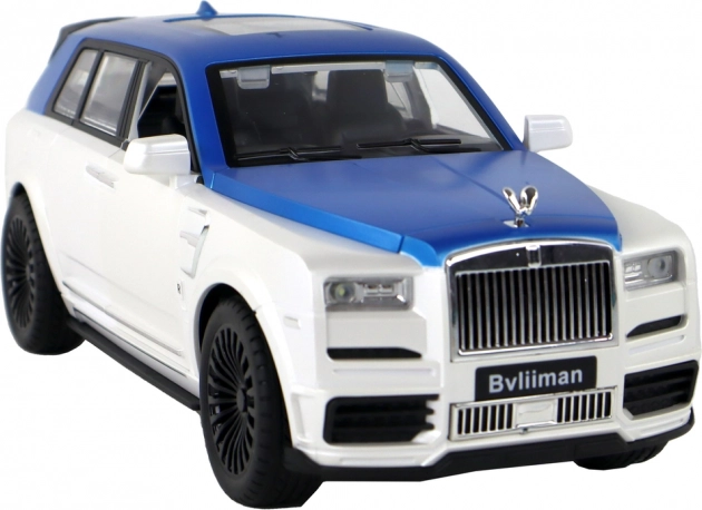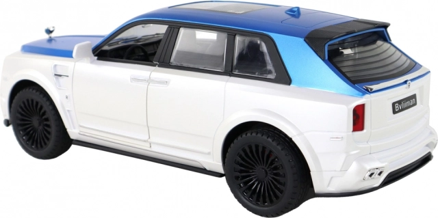Carrosserie blanc-bleu avec détails argentés et portes fonctionnelles pour un look authentique de SUV.