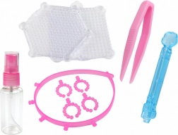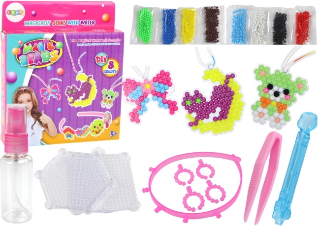 L'ensemble contient des perles en plastique qui peuvent être assemblées avec une goutte d'eau, créant ainsi des formes et des figures permanentes. Après avoir créé diverses décorations ou pendentifs, la chambre d'enfant peut avoir un tout nouveau look. Ils peuvent s'inspirer du manuel inclus ou de l'emballage lui-même.