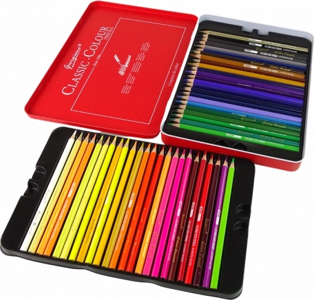 Les crayons sont rangés dans un étui en métal robuste à deux niveaux de couleur rouge mesurant 28 cm x 19 cm x 2,5 cm, ce qui en fait une solution pratique pour le transport et le stockage. Un outil idéal pour ceux qui apprécient l'ordre et la mobilité.
