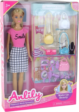 Poupée ANLILY set de stylisme : robe, accessoires de maquillage et de coiffure, 5 sacs à main. Jeu créatif pour enfants 3+. Certification CE, EN71. Dimensions 32×23×5 cm.