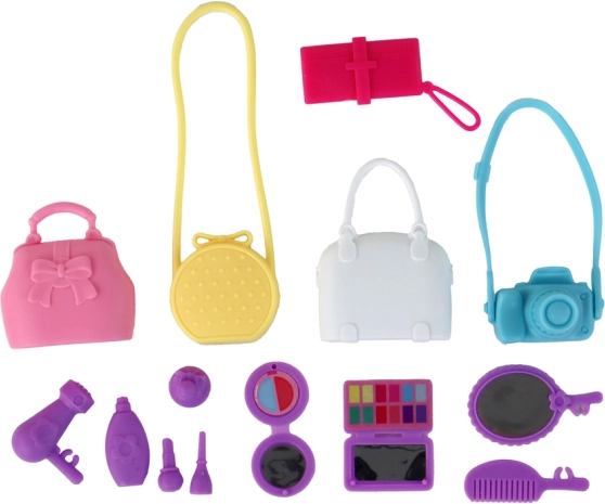 - Poupée en robe, accessoires pour le maquillage et la coiffure, 5 sacs à main