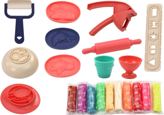 - 10 couleurs de pâte, 5 moules, 2 rouleaux, bol, petite assiette, 2 gobelets, presse, emballage d’origine