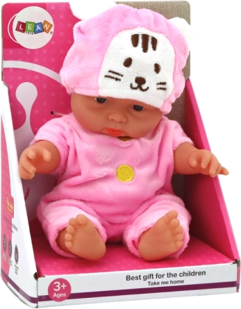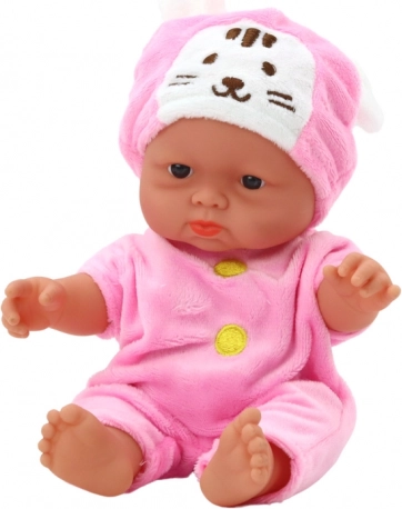 Cette petite poupée bébé séduit par son look attendrissant et sa qualité de fabrication. Grâce à ses dimensions compactes, elle tient facilement dans les petites mains et est parfaite pour les voyages comme pour le jeu quotidien. La tenue rose avec boutons jaunes et le bonnet à oreilles de lapin lui donnent un charme unique.