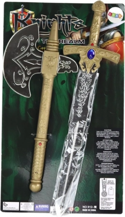 Le pack comprend une épée et une hache sur un support en carton au motif médiéval – prêt à être offert et à jouer immédiatement.