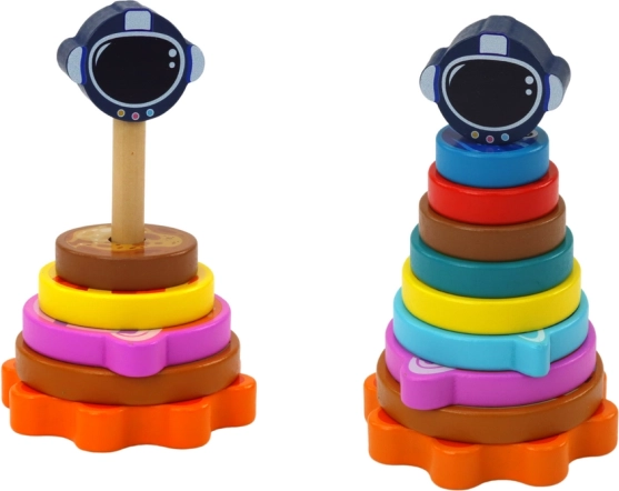 La pyramide empilable en bois sur le thème de l’espace allie jeu et apprentissage. Les enfants trient les anneaux colorés – les « planètes » – par taille, exerçant ainsi la comparaison, l’orientation et la patience. La pièce finale en forme de casque spatial apporte la satisfaction d’une tâche accomplie.