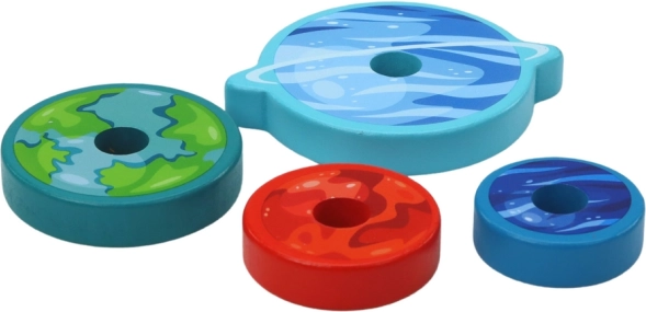 Les « planètes » en bois colorées de tailles variées apprennent le tri, la comparaison et la reconnaissance des couleurs.