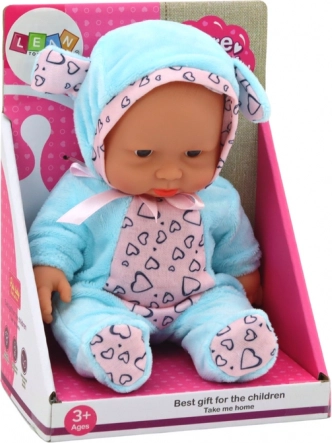 Adorable petite poupée – bébé en tenue bleue avec des cœurs et bonnet à oreilles qui ravira chaque petite fille. Elle a des bras et jambes articulés, une tête rotative et, grâce à ses dimensions compactes 21 × 14 × 6,5 cm, elle convient aussi bien aux voyages qu’au lit d’enfant. Le jouet est certifié CE et conforme à la norme EN71, recommandé à partir de 3 ans.