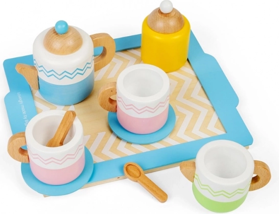 Ce riche service à thé offre tout le nécessaire pour de petits hôtes – des tasses jusqu’à la théière et au plateau. La fabrication en bois de qualité, les finitions lisses et les délicates couleurs pastel invitent au jeu, qui développe l’imagination, la communication et les règles de base de la table.