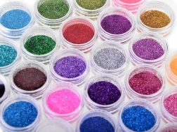 Des paillettes colorées dans des pots transparents permettent de mélanger les teintes et de créer des effets uniques et scintillants sur la peau.