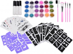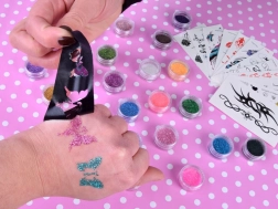 18 feuilles de pochoirs pour tatouages pailletés, 12 feuilles de tatouages à l’eau, 3 colles, 5 pinceaux, 24 pots de paillettes