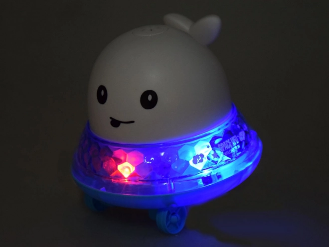 Hors de l’eau, la fête continue : placez la baleine sur la plateforme, allumez-la et regardez-la rouler au rythme d’une musique joyeuse et de lumières.