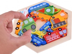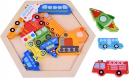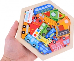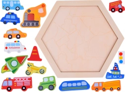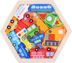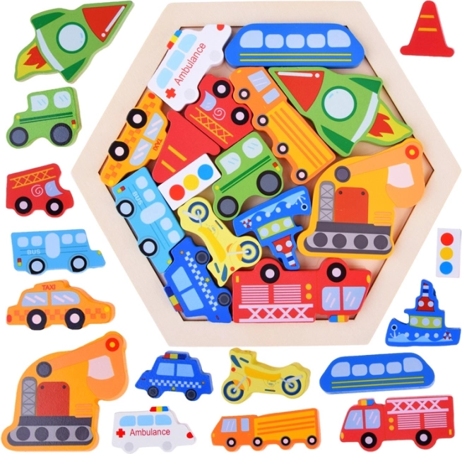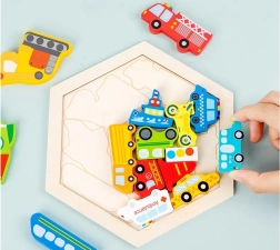 Découvrez un jouet amusant et éducatif pour de petits explorateurs : un puzzle en bois avec des pièces en forme de véhicules et un plateau hexagonal. En jouant, les enfants entraînent leur motricité fine, leur pensée logique et leur représentation spatiale. Les pièces colorées aident à apprendre les couleurs, à compter et à connaître les noms des véhicules, tout en offrant de nombreuses possibilités de jeu libre.