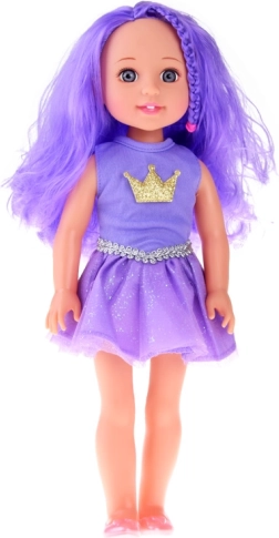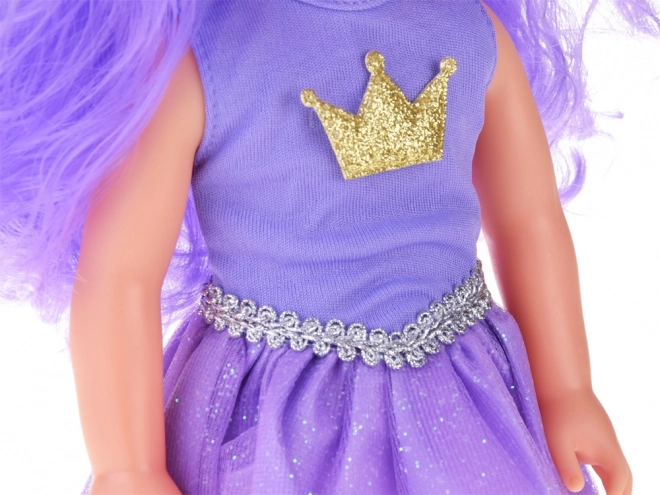 La robe violette avec un emblème de couronne dorée et une ceinture argentée donne à la poupée une allure royale et stimule le jeu imaginatif.