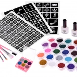 Cette grande trousse de tatouages pailletés est un vrai succès pour toutes les occasions. Elle contient une large palette de couleurs et de motifs pour un art corporel créatif et éblouissant.