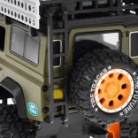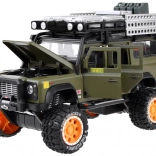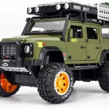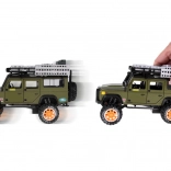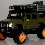 Découvrez une voiture tout terrain en métal bien travaillée pour chaque petit aventurier. La voiture est de couleur verte élégante avec des détails soigneusement travaillés comme le porte-bagages de toit avec un bidon et des boîtes.