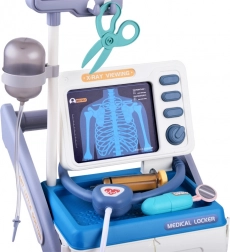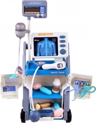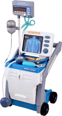 Ce chariot médical stable sur roulettes offre aux enfants tout ce dont ils ont besoin pour jouer au docteur : un moniteur avec cartes pour les « radiographies » et le test de vision, une armoire de rangement avec tiroir coulissant et de nombreux outils en plastique sûrs aux couleurs conviviales. Une fois les piles insérées, le panneau interactif émet des sons de surveillance des fonctions vitales, le thermomètre bippe et s’illumine, et le stéthoscope permet d’entendre les battements du cœur.