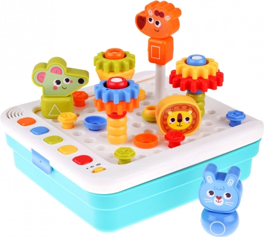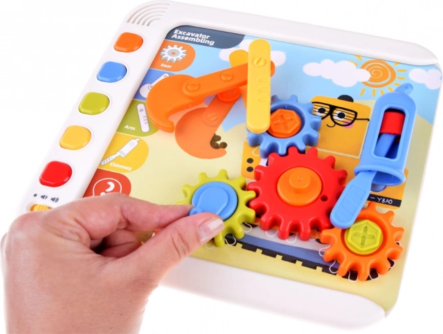 Le set comprend un panneau électronique, un tiroir pour les pièces, 5 cartes thématiques, des briques colorées et des engrenages, des figurines d’animaux (girafe, lapin, souris, lion) et un petit livre illustré en couleurs. L’enfant peut construire des structures mobiles, développer la coordination œil–main et comprendre la mécanique des transmissions. Le bouton rouge sur le panneau lance des défis supplémentaires pour encore plus de plaisir.