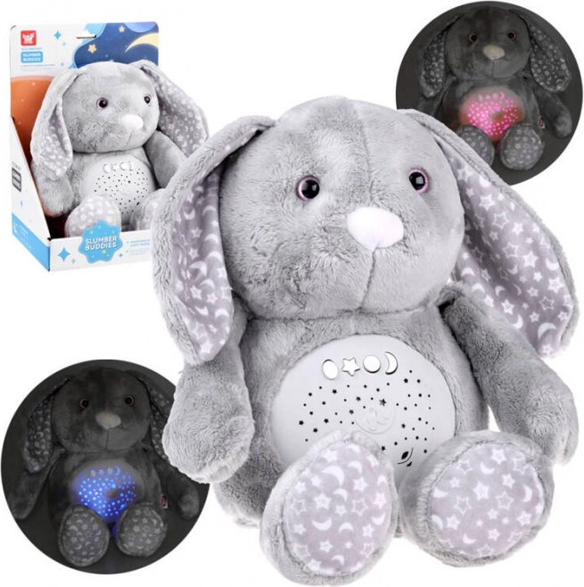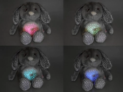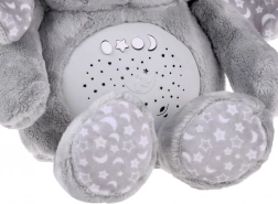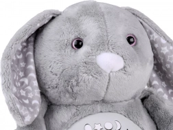 Ce lapin en peluche doux est fabriqué à partir d'un matériau délicat de couleur grise douce, décoré de motifs d'étoiles et de lunes sur les oreilles et les pattes. Les yeux sont en plastique, tandis que le nez est brodé, donnant au jouet un aspect mignon. Grâce au panneau interactif situé dans le ventre du lapin, il devient un compagnon indispensable pour les enfants qui ont des difficultés à s'endormir seuls.