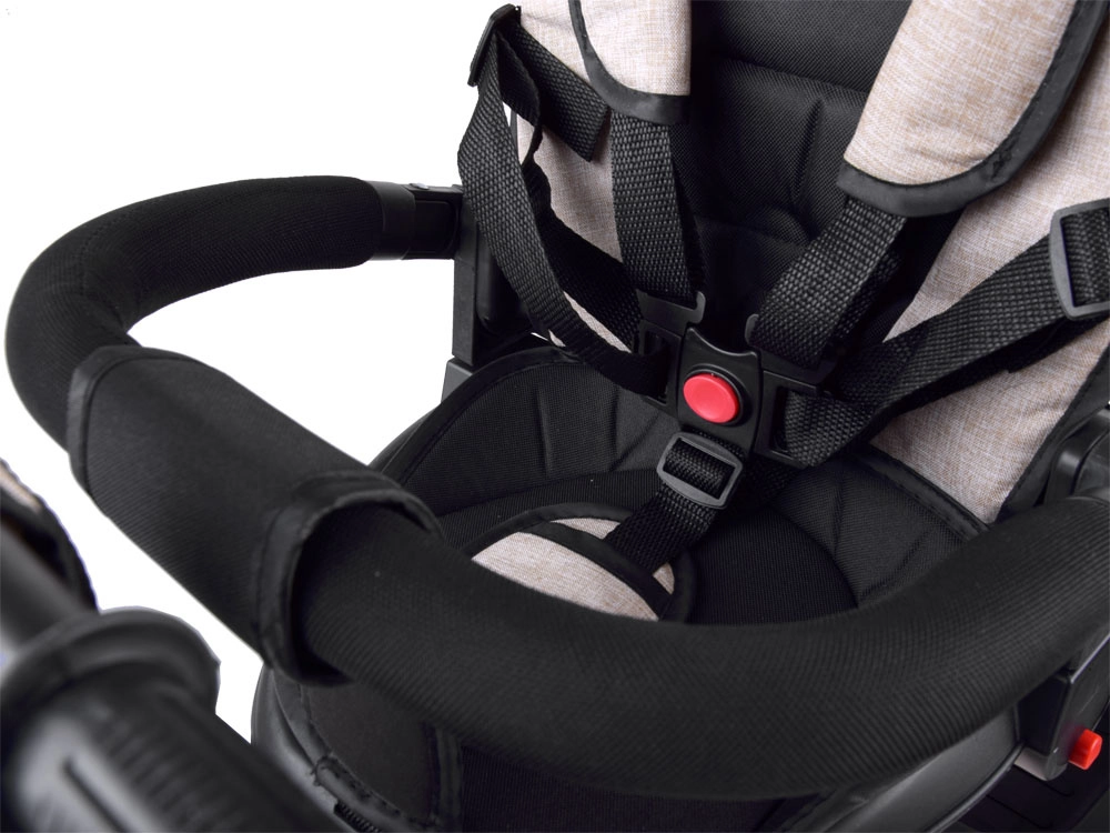 • Sécurité : harnais 5 points, barre souple, poignées antidérapantes, sonnette