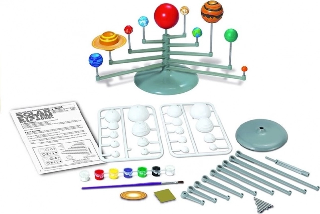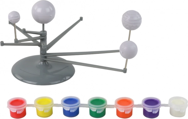 - Support avec bras, planètes à assembler, peintures, pinceau, gabarit d’anneau pour Saturne, notice