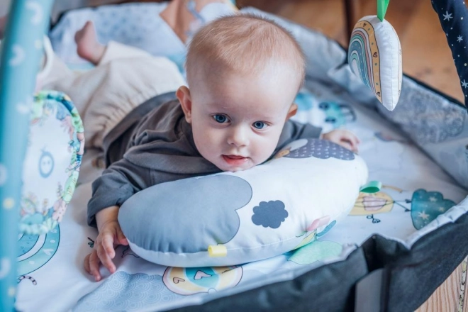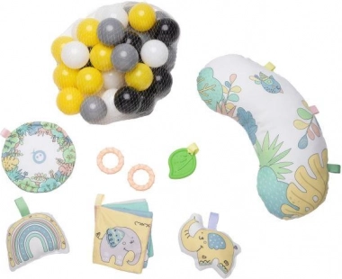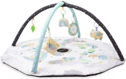 Le tapis d’éveil est fourni avec des jouets qui peuvent être suspendus aux arches ou utilisés séparément. Il comprend : un miroir, un anneau de dentition et un livre bruissant. Le tapis comporte également un petit coussin en forme de croissant qui aide votre bébé lors de ses premières tentatives de ramper.