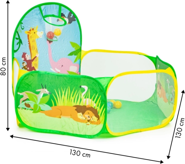L’emballage comprend 50 balles en plastique (Ø 6 cm), qui transforment la tente en une piscine à balles amusante. Le panier de tir intégré motive au mouvement, développe la coordination et la précision. Le fond résistant est prêt pour jouer à l’intérieur comme à l’extérieur.