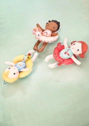 La poupée flotte grâce à sa bouée colorée en forme de licorne et invite les enfants à vivre de joyeuses aventures aquatiques dans la baignoire comme à la piscine.