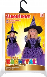 Le déguisement comprend un chapeau assorti, décoré du même motif que la robe, apportant une touche authentique de sorcière.