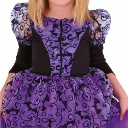 La robe est ornée d’un motif de chauves-souris noires, avec une jupe bouffante et des manches trois-quarts, idéales pour toute célébration.