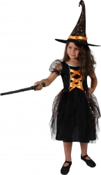 Costume de carnaval magique pour petites sorcières. Ce costume noir avec rubans orange et petites étoiles métalliques est idéal pour Halloween ou d’autres fêtes de carnaval.