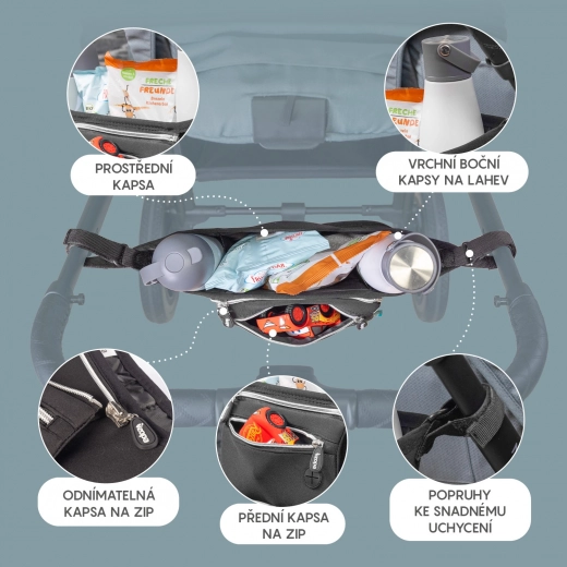 - Fixation facile : Se fixe à la plupart des poussettes à l’aide de bandes auto-agrippantes.
