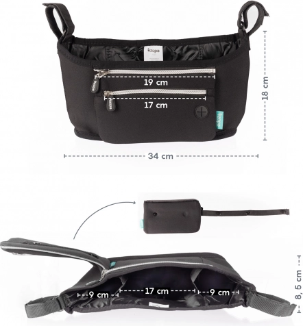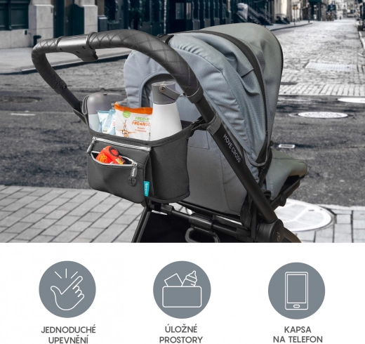 Organiseur universel en néoprène pour poussette, qui protège vos affaires et offre une fixation facile sur la plupart des poussettes grâce aux bandes auto-agrippantes.