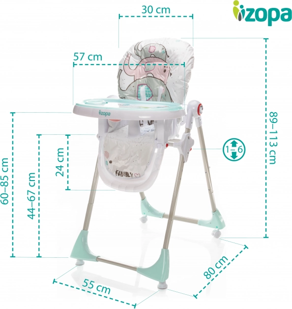 La chaise haute Monti aux motifs amusants d’animaux s’adapte facilement aux besoins de votre enfant de 6 mois à 3 ans ou jusqu’à 15 kg, grâce au réglage non seulement de la hauteur de la chaise, mais aussi de l’inclinaison du dossier et du repose‑pieds, ainsi qu’au réglage de la distance du plateau. Tout cela garantit à votre enfant une assise à la fois confortable et sécurisée pendant les repas et autres activités.
