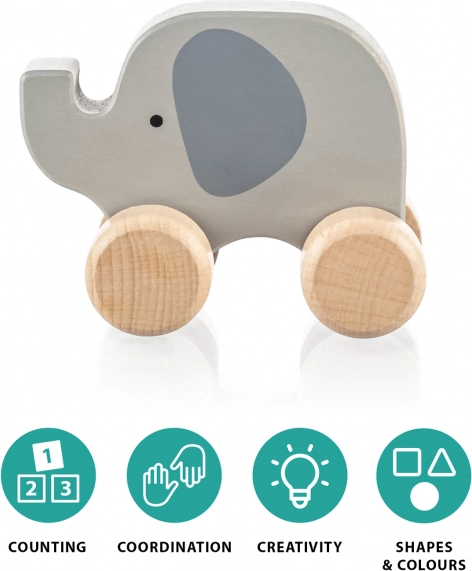 Léger et compact, l’éléphant en bois est un excellent compagnon pour les premières courses dans la chambre comme sur le terrain de jeu. Grâce à ses bords lisses et à sa forme ergonomique, il tient bien dans les petites mains et encourage le jeu autonome ainsi que les premiers pas.