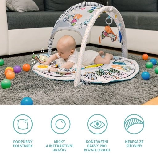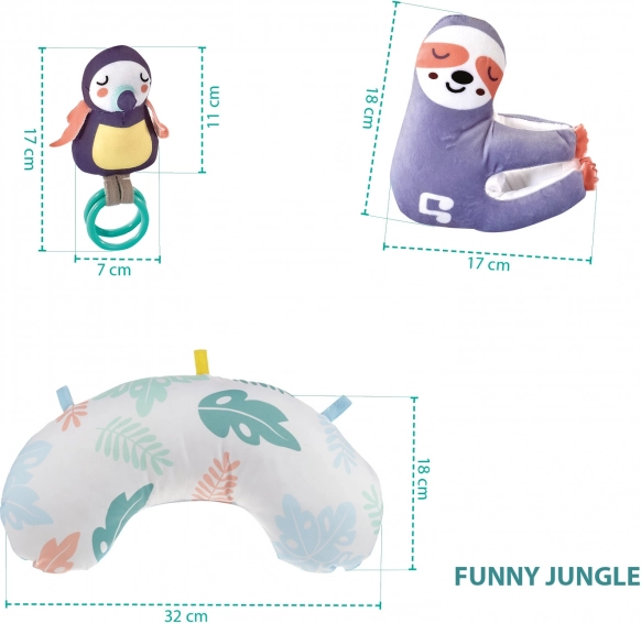 Découvrez le tapis d’éveil Funny Jungle avec matelas doux, arche et jouets suspendus. Il favorise le développement psychomoteur, stimule la vue grâce à des couleurs contrastées et propose des mélodies apaisantes pour votre bébé. Inclus : un coussin de soutien pour le temps sur le ventre et 20 balles colorées pour encore plus de plaisir.