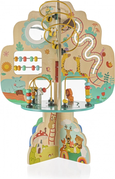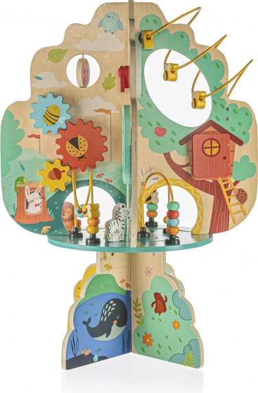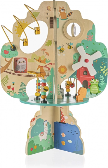 Une large gamme d’activités interactives grâce aux labyrinthes de perles, aux éléments rotatifs et aux illustrations d’animaux.