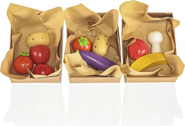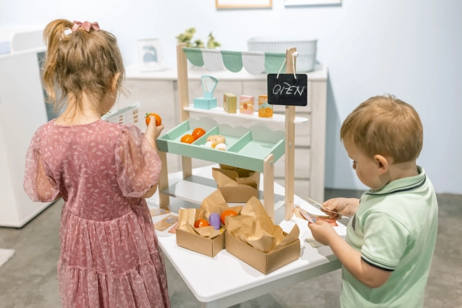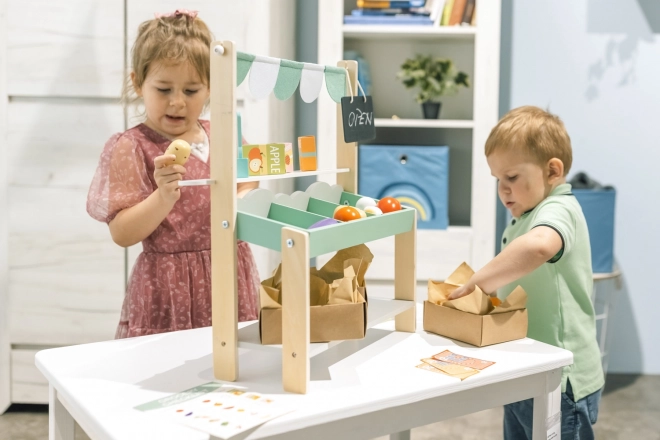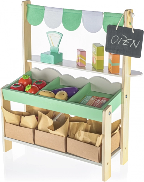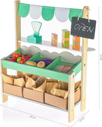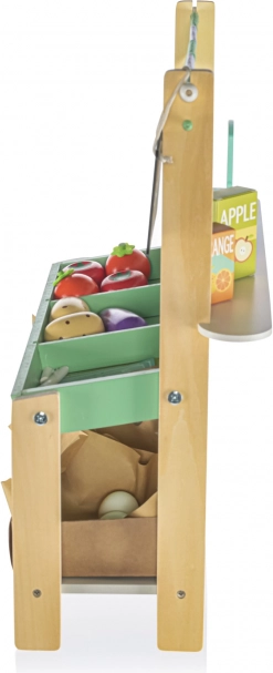 Équipement commercial complet – tous les accessoires nécessaires sont inclus. Vous y trouverez des cagettes en bois, une balance, une liste de courses et de l’argent. Les enfants peuvent endosser les rôles de commerçants et de clients et apprendre le fonctionnement d’un marché.