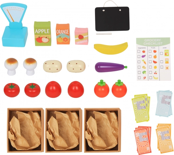 Le coffret comprend tout le nécessaire pour vendre au marché – fruits et légumes en bois, balance et liste de courses.