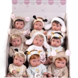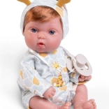 La poupée est habillée d’une adorable tenue à motif girafe, complétée par un bandeau avec de petites oreilles jaunes et une tétine, ce qui renforce son aspect réaliste.