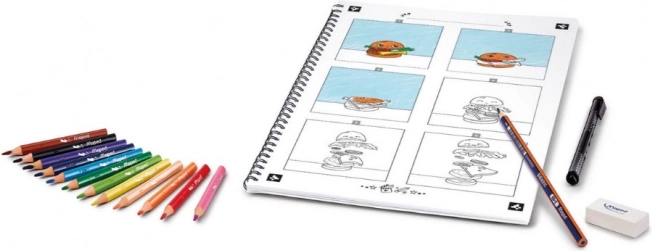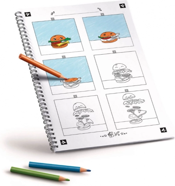 Les enfants colorient les modèles ou imaginent leurs propres histoires en les écrivant dans les cadres vides prévus. Les dessins se transforment facilement en véritables histoires animées. Il suffit de photographier 12 illustrations en couleur disposées sur deux pages voisines du cahier dans l’application gratuite spécialement conçue, et c’est prêt.