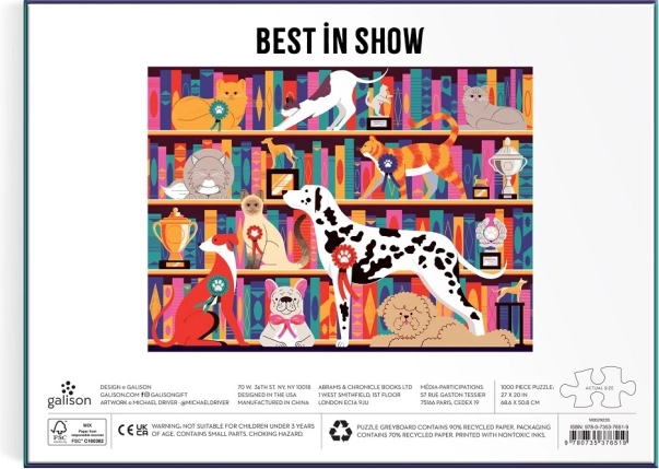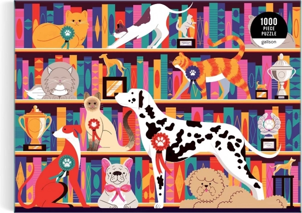 Le puzzle présente des illustrations vivantes de chiens et de chats d’exposition sur des étagères garnies de trophées, ce qui apporte une nouvelle dimension au jeu.