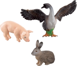 Comprend trois figurines en plastique réalistes : un porcelet, un lapereau et une oie aux ailes déployées, réalisées dans des couleurs naturelles.