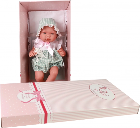 Pablo est vêtu d’une combinaison d’été sans manches vert et blanc à jambes courtes, décorée de dentelle blanche, complétée par un bonnet à nouer. Il est allongé sur un coussin moelleux avec couette et dispose d’une tétine sur chaînette que l’on peut insérer dans la bouche, où elle tient fermement. Le fabricant ASI (Asivil) est une marque familiale espagnole avec plus de 50 ans de tradition, privilégiant un savoir‑faire 100 % local et des standards européens stricts.