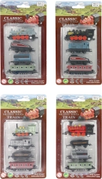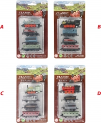 Le set comprend une locomotive en métal et trois wagonnets en plastique, idéal pour les petits collectionneurs.