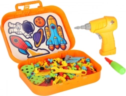 - perceuse pour enfants avec deux embouts, tournevis, clé, vis ×80, éléments de construction ×32, embouts ×100, extensions ×35, connecteurs ×8, éléments décoratifs à thème spatial, carte d’inspiration, valisette