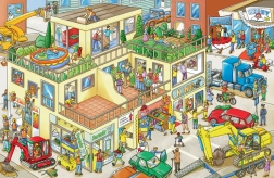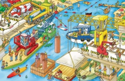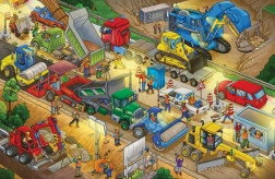 Le livre présente des scènes richement illustrées qui représentent l'environnement vivant d'un chantier avec différentes machines de construction.
