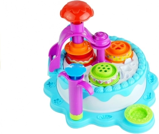 - 6 pots de pâte à modeler, base en forme de gâteau, assiettes, couverts, extrudeuse avec embouts interchangeables, 2 chapeaux de fête, notice