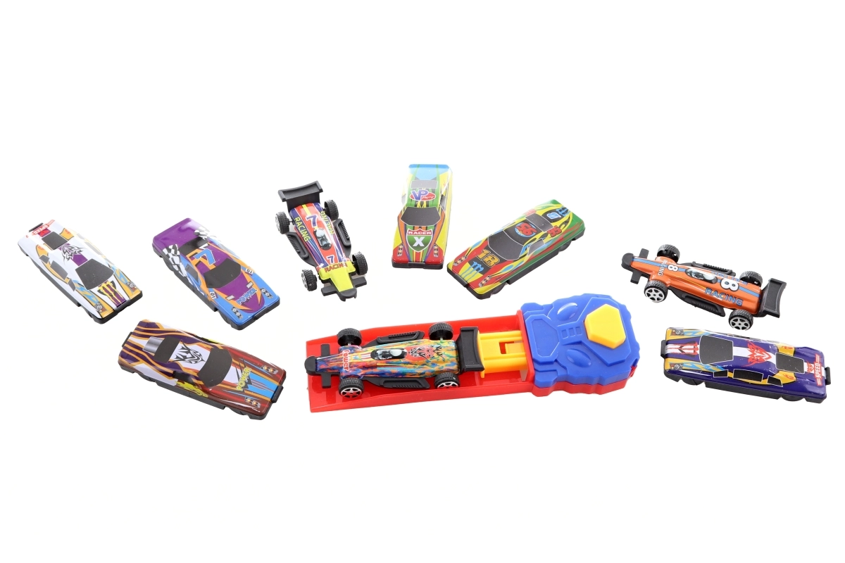 Le contenu comprend 9 voitures métalliques et une base de lancement pour créer facilement des scènes de course palpitantes. Les dimensions compactes sont idéales pour jouer à la maison comme en voyage.