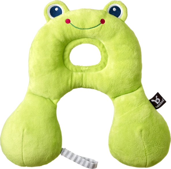 Adorable coussin de cou pour enfants en forme de grenouille qui offre à bébé en voyage un maintien confortable de la tête et un sommeil agréable. Il est réversible – d’un côté peluche chaude pour les jours plus frais, de l’autre matière légère et respirante pour l’été. Entretien facile en machine à 30 °C.