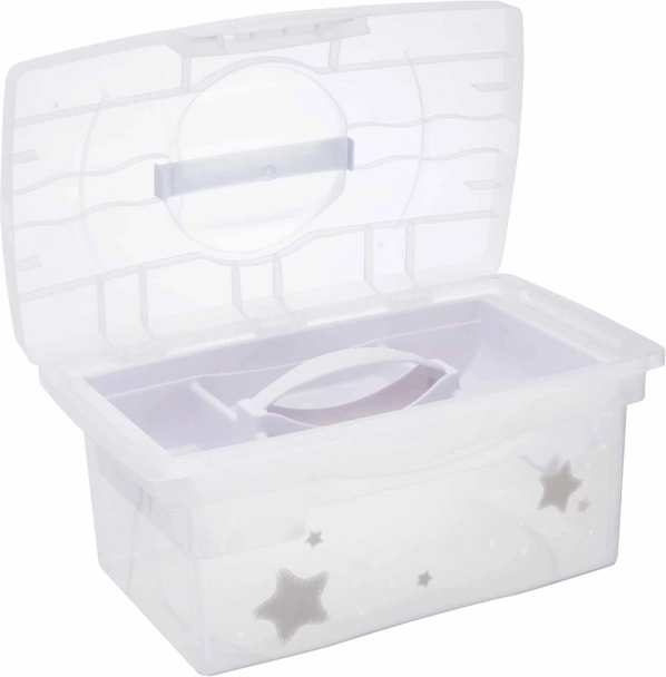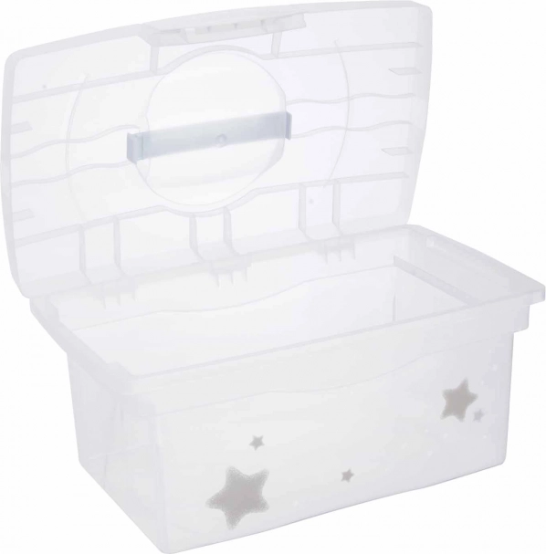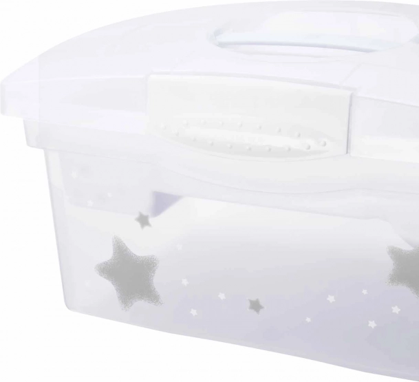 Boîte de voyage universelle au motif élégant Stars alliant praticité et design moderne. Les parois transparentes ornées d’étoiles facilitent l’orientation rapide dans le contenu, tandis que le couvercle robuste avec poignée garantit un transport sûr et confortable. À l’intérieur, un insert amovible avec compartiments accueille les petits objets.